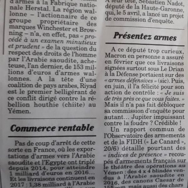 Un article paru le mercredi 18 juillet dans le Canard enchaîné, où l’on parle de l’action de Sébastien NADOT, député et porte-parole du Mouvement des Progressistes, pour obtenir une commission d’enquête sur la vente d’armes aux belligérants du conflit au Yémen.